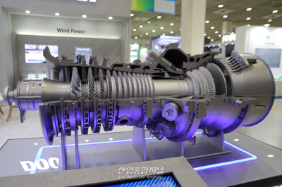 두산에너빌리티(Doosan Enerbility)가 15일부터 17일까지 삼성동 코엑스(COEX)에서 개최한 ‘스마트에너지플러스 2025(SEP)’에 발전용 가스터빈 ‘DGT6-300H 시리즈’의 축소 모형을 전시했다. 이 제품은 380MW급의 대형 터빈으로 기존의 가스터빈 연료인 LNG 가스를 수소로 대체할 수 있다.