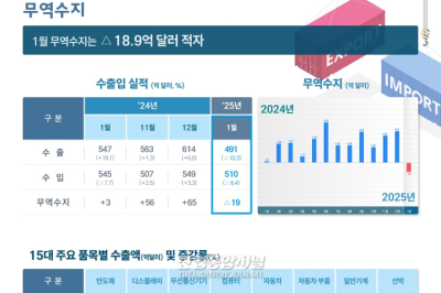 1월 수출은 전년 동기 대비 10.3% 감소한 491.2억 달러, 수입은 6.4% 줄어든 510.0억 달러를 기록했다. 이에 따라 무역수지는 18.9억 달러 적자를 나타냈다. 조업일수가 지난해 1월보다 4일 줄어든 20일로, 2000년 이후 1월 중 최저치를 기록하면서 수출이 일시적으로 둔화됐다. 그러나 조업일수