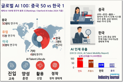글로벌 인공지능(AI) 패권 경쟁이 '기술'을 넘어 '인재'로 옮겨가고 있다. 단순한 개발 속도가 아니라, 기술을 지속가능하게 밀어붙일 수 있는 사람의 문제, 그 사람을 제도 속에 어떻게 설계하느냐의 문제가 국가 경쟁력을 좌우한다. 세계 100대 AI 연구자 중 절반 이상이 중국계라는 통계는