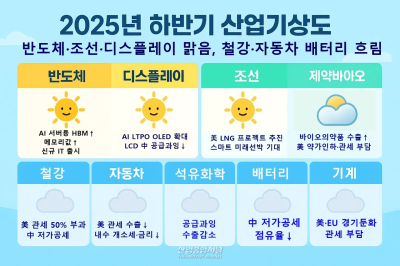 올 하반기 산업 기상도가 극명한 온도차를 드러냈다. 대한상공회의소가 11개 주요 업종별 협·단체와 공동 조사한 결과, 반도체, 디스플레이, 조선, 제약바이오 산업은 AI 인프라 투자와 트럼프 정책 수혜로 ‘맑음’이 예보됐지만, 철강, 자동차, 석유화학, 배터리, 섬유패션, 기계, 건설