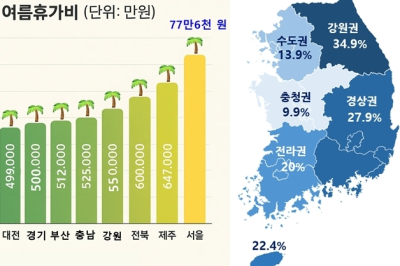 직장인 10명 중 8명은 올해 여름휴가를 떠날 계획이며, 평균 54만원을 지출할 것으로 조사됐다. 특히 국내여행을 선택한 비중이 80%를 넘어서며, 강원·경상·제주 지역에 대한 선호가 높게 나타났다. 대한상공회의소가 직장인 800명을 대상으로 조사한 ‘여름휴가 계획 및 정책과제’에 따르면, 직