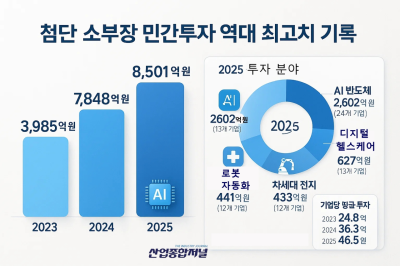 올해 첨단 소재·부품·장비(소부장) 분야 민간투자가 역대 최고치를 경신했다. AI반도체와 디지털 헬스케어가 투자 확대를 주도한 것으로 나타났다. 산업통상자원부는 ‘2025년 소부장 투자연계형 기술개발사업’을 통해 총 8천501억 원의 민간투자를 유치했다고 밝혔다. 이는 지난해보다 653억