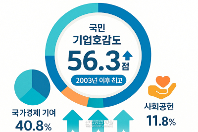 올해 국민의 기업에 대한 호감도가 56.3점으로 나타나 2003년 관련 조사 시작 이래 가장 높은 수치를 기록했다. 대한상공회의소가 전국 성인 1천 명을 대상으로 실시한 ‘2025년 기업호감지수(CFI)’ 조사 결과다. 기업에 대한 전반적 인식이 긍정적으로 변하고 있음을 보여준다. 대한상의는 조사에