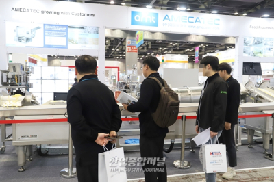 스낵 제조설비 전문기업 에이메카텍이 27일 일산 킨텍스에서 진행 중인 ‘2023 한국포장전(2023 HANKOOK PACKAGING SHOW)’에 참가해 ‘관성이송장치’와 ‘오일 필터 시스템’을 소개했다. 컨베이어벨트는 양념이 묻으면 변색되고 벨트 실밥이 터져 이물질이 유입될 수 있다. 벨트를 알코올로 세척하