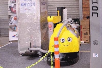 19일 킨텍스에서 열린 '제13회 국제물류산업대전(KOREA MAT 2023)'에 참가한 한 업체가 이동식 로봇 랩핑기를 시연하고 있다. 이 업체는 “눈 스티커를 붙이지 않고 납품했더니 오히려 볼멘소리를 들었다.”라며 “랩핑 근로자 중에 여성들이 많아 로봇이 귀여워서 좋다는 의견이 많았다.”라