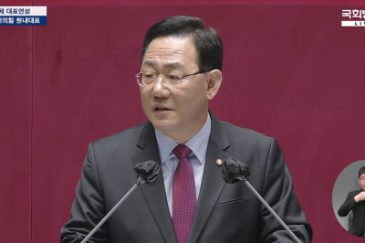주호영 국민의힘 원내대표가 “실행 가능한 탄소중립을 위한 마스터플랜이 보이지 않고, 이 문제의 절박성을 정부나 국민이 실감하지 않고 있는 것이 위기의 본질”이라고 14일 ‘제403회 국회(임시회) 제6차 본회의’ 교섭단체 대표연설에서 말했다. 모두가 탄소중립을 말하고 있지만 탄소중립을