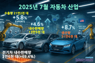 글로벌 경기 불확실성 속에서도 국내 자동차산업이 7월에 ‘트리플 증가’를 기록했다. 수출·내수·생산이 모두 늘었고, 전기차 내수판매량과 친환경차 판매 비중은 역대 최고치를 새로 쓰며 산업 전반의 전환 흐름을 드러냈다. 산업통상자원부가 발표한 ‘2025년 7월 자동차산업 동향’에 따르면,
