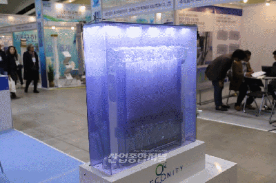 인천 송도컨벤시아에서 7일 열린 ‘그린에너지·환경산업전(GreenEnerTEC 2023)'에 중공사막 형태의 침지형 분리막이 출품됐다. 해당 제품은 하수·폐수 처리용도로, 0.1㎛(마이크로미터)크기의 구멍을 통해 오염수를 여과해 깨끗한 물을 분리해 낸다. 수중에서 흡사 말미잘처럼 흐느적거리는 자