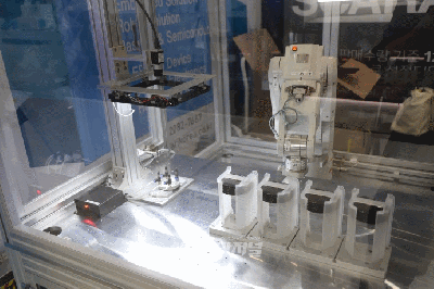 로봇과 비전을 결합한 PCB 전압/전류 검사 자동화 시스템이 ‘제25회 반도체대전 (Semiconductor Exhibition 2023, SEDEX)’에서 시연됐다. 해당 시스템은 로봇이 PCB를 픽업하고 비전 검출 후 전압/전류를 측정한 뒤 분류하는 식으로 구성됐다. 6축 로봇이 활용돼 고속에서도 정밀하게 움직인다.