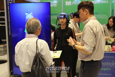 모션캡쳐 전문업체가 코엑스 D홀에서 열린 ‘코리아 메타버스 페스티벌 2023 (KMF 2023)’에 참가해 모션캡쳐 솔루션을 선보였다. 해당 솔루션은 바디슈트, 페이셜, 핑거 전용 3개 장비로 이뤄진다. 먼저, 카메라 없이 어디서든 촬영 가능한 자이로식 바디슈트는 관절마다 부착된 센서를 통해 동작을 디지