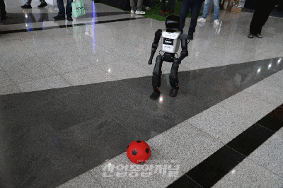 ‘AW 2026 (2026 스마트공장·자동화산업전)’이 진행 중인 5일 오후 서울 삼성동 코엑스(COEX)의 B홀 로비에서 휴머노이드 로봇의 축구 동작이 시연돼 참관객들의 관심을 모았다. 로봇은 머리부에 탑재된 카메라를 통해 공의 위치를 파악하고 접근해 주변 상황을 살핀 뒤, 발로 차는 동작을