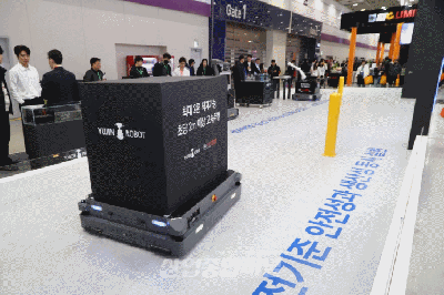 자율주행 물류로봇 전문기업 유진로봇(YUJIN ROBOT)이 ‘AW 2026 (2026 스마트공장·자동화산업전)’에서 고중량 AMR ‘GoCart 1500’이 장애물을 피해 고속 주행하는 모습을 시연했다. 로봇은 최대 2톤의 물류를 적재할 수 있고, 2m/s의 속도로 주행 가능하다. 국제 로봇 안전 기준인 ‘ISO 13