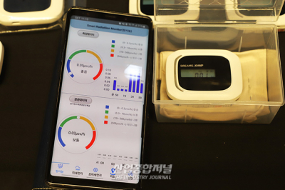 삼성동 코엑스에서 열린 ‘2023원전생태계박람회’에 휴대용 방사선 감지기가 나왔다. 해당 제품 자체만으로는 실시간으로 측정한 감마선을 디스플레이로 볼 수 있지만, 스마트폰과 블루투스 등으로 연동하면 시각화 한 방사선 수치를 확인할 수 있다. 또, 미세먼지, 초미세먼지와 더불어 시