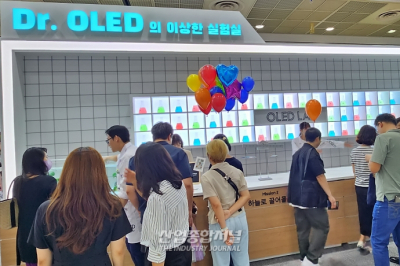 세계 1위 디스플레이 산업국의 위상을 다질 '2023 한국디스플레이산업전시회(K-Display 2023)'가 16일 서울 삼성동 코엑스에서 개막했다. 삼성디스플레이는 기술력을 재미있는 실험으로 체감할 수 있는 'Dr.OLED의 이상한 실험실' 부스를 운영해 참관객들의 관심을 받았다. 한편, 삼성디스플레이의
