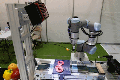 ‘2023 소재·부품·장비 중소기업 대전(CoMPEX KOREA 2023, 이하 컴펙스 코리아)’에서 3D비전 카메라 업체가 비전 AI를 활용한 로봇 작업을 시현했다. 3D비전 카메라가 물체를 인식해 로봇 팔에 좌푯감을 전송하면, 로봇이 물건을 집어 이송 작업을 하는 방식이다. 해당 제품은 프로젝터와 카