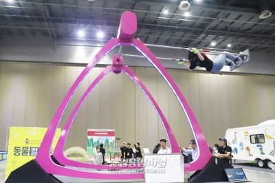 ‘2023 코리아 테마파크&어뮤즈먼트 페어(2023 KOREA THEME PARK&AMUSEMENT FAIR)’를 찾은 참관객이 그네를 타고 하늘로 솟구쳤다. 그네는 손목, 발목, 허리에 안전장치를 착용하고 떨어질 위험 없이 즐길 수 있다. 업체 관계자는 “한국의 전통놀이인 그네에 ICT 기술을 융합했다”면서, “배틀게임