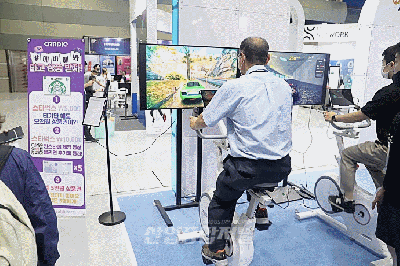 '2022 4차산업혁명 페스티벌'에 방문한 관람객이 메타버스 운동 플랫폼을 연동한 실내 자전거 페달을 구르고 있다. 15일 서울 코엑스에서 열린 '2022 4차산업혁명 페스티벌'은 오는 17일까지 진행한다.