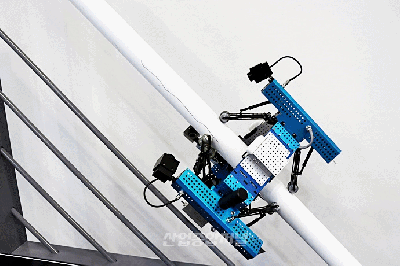 30일 일산 킨텍스에서 열린 스마트건설엑스포에 등장한 교량 케이블 점검용 로봇이 모형 기둥을 오르며 시연 중이다. 상하좌우 각도 조절이 가능한 3개의 카메라가 달린 로봇이 케이블을 오르며, 금간 부분이나 도장이 벗겨진 곳 등을 사용자에게 영상으로 전송한다. 현장에서 만난 관계자는 "