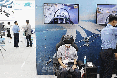 18일 서울 삼성동 코엑스(COEX)에서 열린 2022 무인이동체산업엑스포(UWC, Unmanned System World Congress 2022)에 방문한 한 관람객이 VR(가상현실) 장비를 활용해 가상 속 전투기를 체험하고 있다. 이번 전시회는 19일까지 진행한다.