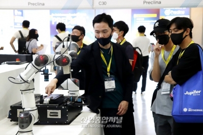 4일 서울 코엑스에서 열린 바이오플러스-인터펙스 코리아 2022(BIOPLUS-INTERPHEX KOREA 2022)에는 로봇팔이 가공물을 옮기는 작업을 수행하고 있다. 머신텐딩(Machine Tending)이란 로봇을 활용해 소재를 가공 기계에 투입하고, 다음 과정으로 이동하는 자동화 공정을 일컫는다. 출품 업체 관계자