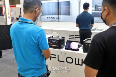 30일 일산 킨텍스(KINTEX)에서 열린 2022 세계태양에너지엑스포(International Solar Energy EXPO & Conference)에 방문한 관람객이 휴대용 미니 발전기를 관람하고 있다. 이 발전기는 720Wh 리튬이온 배터리를 탑재했으며, 리버프로 확장 배터리와 연결 시 1천440Wh까지 확대 가능하다. 특히, 11