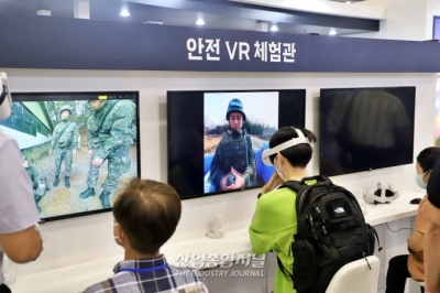 일산 킨텍스(KINTEX)에서 4일 열린 2022 국제안전보건전시회(Korea International Safety & Health Show)에 방문한 관람객들이 VR(가상현실)을 통해 산업 현장 내 위험 상황을 체험하고 있다. 한편, 한국산업안전보건공단이 주최하고, (사)한국보호구협회가 주관한 이번 행사는 7일까지 진행한다.