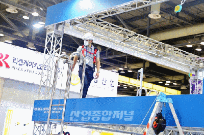 4일 일산 킨텍스(KINTEX)에서 진행 중인 2022 국제안전보건전시회(Korea International Safety & Health Show)에 참가한 (주)코브이터내셔날 관계자가 레일식 추락방지시스템을 활용해 고소 작업대 위를 이동하고 있다. 한편, 이번 전시회는 7일까지 진행한다.