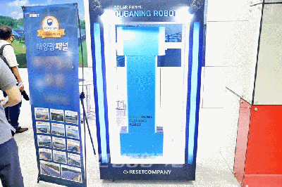 30일 일산 킨텍스(KINTEX)에서 진행 중인 2022 세계태양에너지엑스포(International Solar Energy EXPO & Conference)에는 태양광 패널 위 조류 배설물 등을 처리할 수 있는 무인청소 로봇이 시연을 펼치고 있다. 세계태양에너지엑스포는내일(7월 1일)까지 개최한다.