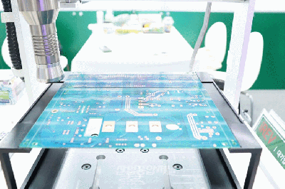 ‘2022 세계 태양에너지 엑스포(EXPO SOLAR 2022)’에 전시된 플라즈마 표면처리기가 기판 위로 표면처리 작업을 시연 중이다. 플라즈마 표면처리기는 금속이나 유리 등 무기물 소재의 표면을 세정하는 장비로 고무 및 플라스틱 등에 바르는 접착제의 강도를 높이는 데에도 활용한다. 한편, 고양시