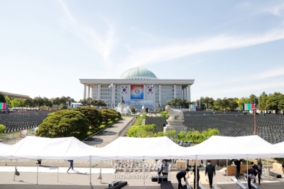 쾌청한 5월 하늘 아래 여의도 국회의사당 본관 앞에는 대통령 취임식을 앞두고 행사를 위한 관계자들의 막바지 준비가 한창이다. 오는 10일 열리는 제20대 대통령 취임식은 오전 10시 식전 행사를 시작으로 11시부터 본행사가 열린다. 국민과 외빈을 포함해 약 4만1천 명이 행사에 참석할