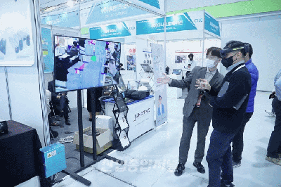 서울 삼성동 코엑스(COEX)에서 열린 2022 스마트팩토리·자동화산업전(Smart Factory+Automation World 2022) 전시 행사장을 방문한 참관객이 가상과 현실을 결합한 MR(혼합현실)용 고글을 착용해 3D로 구축한 건축 도면을 수정하고 있다. 해당 업체 관계자는 “이 제품은 물리적 공간 및 홀로그램 이