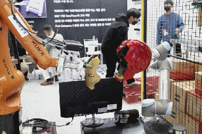 3D 센서를 장착한 로봇암(Robot Arm)이 6일 서울 삼성동 코엑스에서 진행 중인 2022 스마트팩토리·자동화산업전(Smart Factory+Automation World 2022)에서 ‘아이언 맨’ 가면을 조립하고 있다.