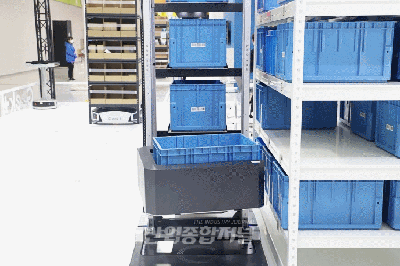 서울 삼성동 코엑스에서 6일 개최한 2022 스마트팩토리·자동화산업전(Smart Factory+Automation World 2022)에는 자율주행 시스템을 접목한 물류 로봇이 상자를 정리하고 있다.