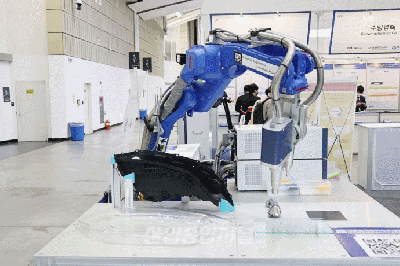 23일 인천 송도컨벤시아에서 열린 ‘2022 대한민국화학제조산업대전(Chemical Manufacturing Expo Korea 2022)'에 다관절 로봇이 플라즈마 표면처리 작업을 수행하고 있다. 플라즈마 표면처리는 고무, 플라스틱과 같은 유기물 재질의 접착·도장·실링 공정에 주로 사용하며, 정밀렌즈를 비롯한 유리나