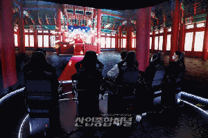서울 종로구 세종로 공원에 위치한 광화전차에서 이용객들이 실감형 콘텐츠를 체험하고 있다. 4일 개관한 광화전차는 문화체육관광부, 한국콘텐츠진흥원이 주최한 광화시대 프로젝트 콘텐츠 중 하나로, 파노라마 화면과 4차원 탑승형 체험기기를 통해 광화문 광장의 역사와 미래를 만나볼 수 있