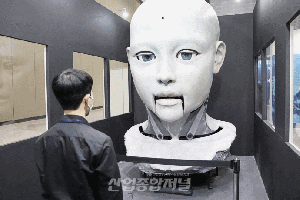 22일 경기도 일산 킨텍스(KINTEX)에서 개최한 ‘2021 대한민국 과학기술대전’(이하 과학대전)에 등장한 인공지능 로봇이 사람의 움직임에 따라 눈을 돌리고 있다. 과학기술정보통신부가 주최하고 한국과학창의재단이 주관하는 ‘2021년 과학융합콘텐츠 개발지원사업’의 성과물인 이 로봇은 노진아