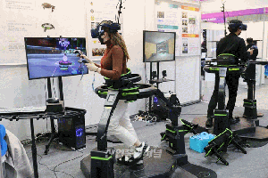 25일 개최한 ‘2021 디지털 대전환 엑스포(DT Expo)’에서 VR(가상현실) 기기를 착용한 참관객이 트레드밀(Treadmill) 위를 걷고 있다. 이 기기는 ㈜리앤팍스(REE&PARKS)가 선보인 VR 시뮬레이터 ‘버툭스 옴니(Virtuix Omni)’로, 허리에 착용하는 하네스, 스마트 센서가 부착된 전용 신발 등을