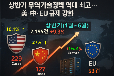 올해 상반기 세계 주요국이 통보한 무역기술장벽(TBT)이 역대 최고치를 기록했다. 미국, 중국, 유럽연합(EU) 등 주요 수출시장의 규제 강화가 원인으로 분석된다. 세계무역기구(WTO) 통계에 따르면 올해 1~6월 세계 각국이 WTO에 통보한 기술규제는 총 2천195건으로, 지난해 동기(2천9건) 대비