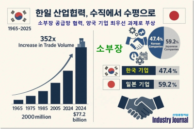 한·일 국교 정상화 60주년을 맞은 올해, 양국의 산업 협력은 과거의 수직적 분업을 넘어 중간재 중심의 수평적 협력으로 재편되고 있다. 무역 규모만 봐도 1965년 2억 달러에서 2024년 772억 달러로 352배나 확대됐고, 교역 구조는 경공업 중심에서 반도체, 철강, 석유화학 등 첨단 중화학 산업