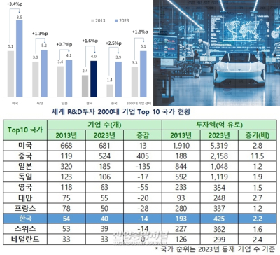 세계 R&D 투자의 중심이 미국과 중국으로 집중되는 가운데, 한국은 투자액 증가에도 불구하고 기업 수 감소를 겪고 있는 것으로 나타났다. 대한상공회의소는 EU 공동연구센터(Joint Research Center)가 발표한 ‘2024년 R&D 투자 스코어보드’를 분석한 결과, 지난해 세계 R&D 투자 상위 2,00