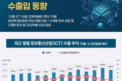 지난달 정보통신산업(ICT) 수출이 208억 달러로 역대 10월 최대치를 기록하며 12개월 연속 상승세를 이어갔다. 주요 품목인 반도체, 휴대폰, 컴퓨터·주변기기에서 고른 호조를 보이며 무역수지 흑자는 74.7억 달러에 달했다. 반도체·컴퓨터 수출 호조, 디스플레이는 부진 10월 ICT 수출은