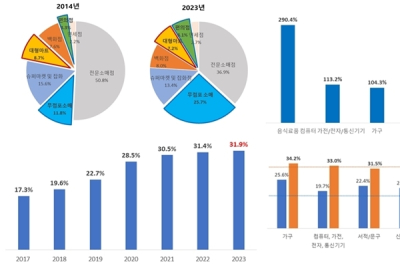 대한상공회의소가 최근 10년(2014~2023)간 소매시장 구조 변화를 분석한 결과, 온라인 쇼핑의 연평균 성장률이 12.6%로 대형마트(1.2%)보다 10배 빠르게 성장한 것으로 나타났다. 편의점 또한 연평균 10.4%의 성장률을 기록하며 소매시장 성장을 이끌었다. 2023년 국내 소매시장 규모는 509